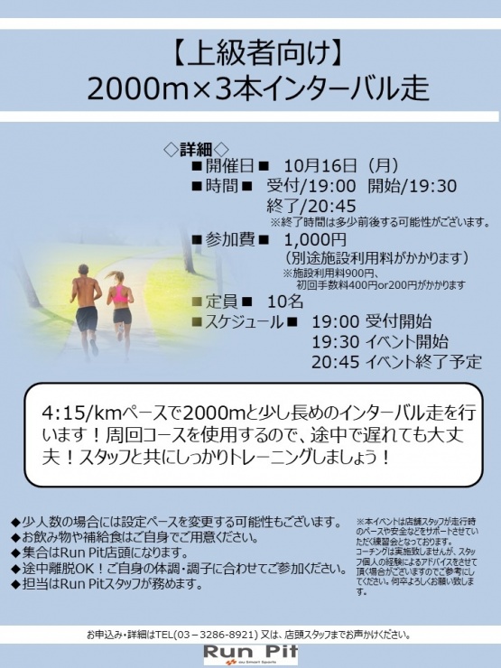 4:15/kmペースで2000mと少し長めのインターバル走を行います!周回コースを使用するので、途中で遅れても大丈夫!スタッフと共にしっかりトレーニングしましょう!