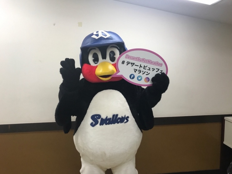 『デザートビュッフェマラソン』は、周回コースを走りながら途中に設置されたビュッフェコーナーでデザートの食べ放題を楽しむランイベントです。ビュッフェコーナーにはケーキをはじめ、チョコレートやタルトなど、約200種類の様々なジャンルのお菓子が並びます。 応援サポーターに「つば九郎」が決定!