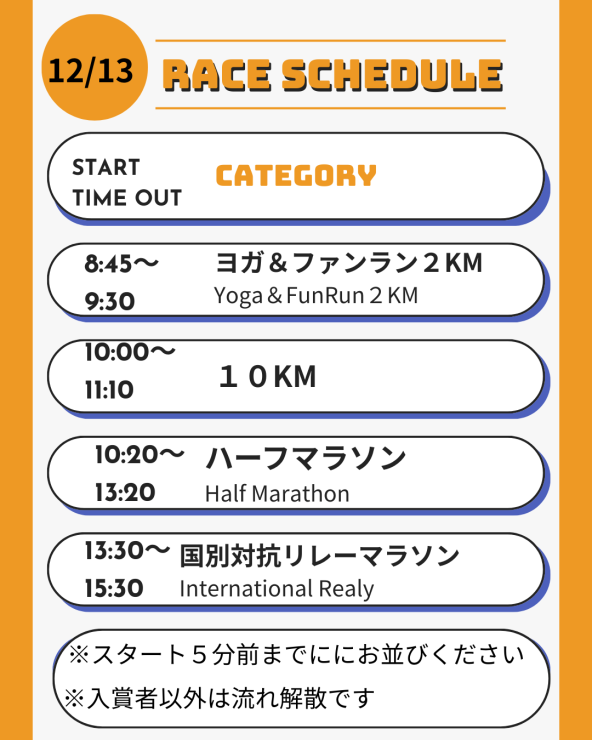 制限時間3時間でベテランペースメーカー【6分,6分30秒,7分,7分30秒】がサポート。初ハーフの方もお気軽に参加できます。ハーフの参加賞は人気ランニングソックス!また国別対抗リレーマラソンも同時開催!国際交流も楽しみましょう。川崎市のスポーツ活動の推進や発展のため、収益の一部を市スポーツ振興基金に寄付します後援:川崎市