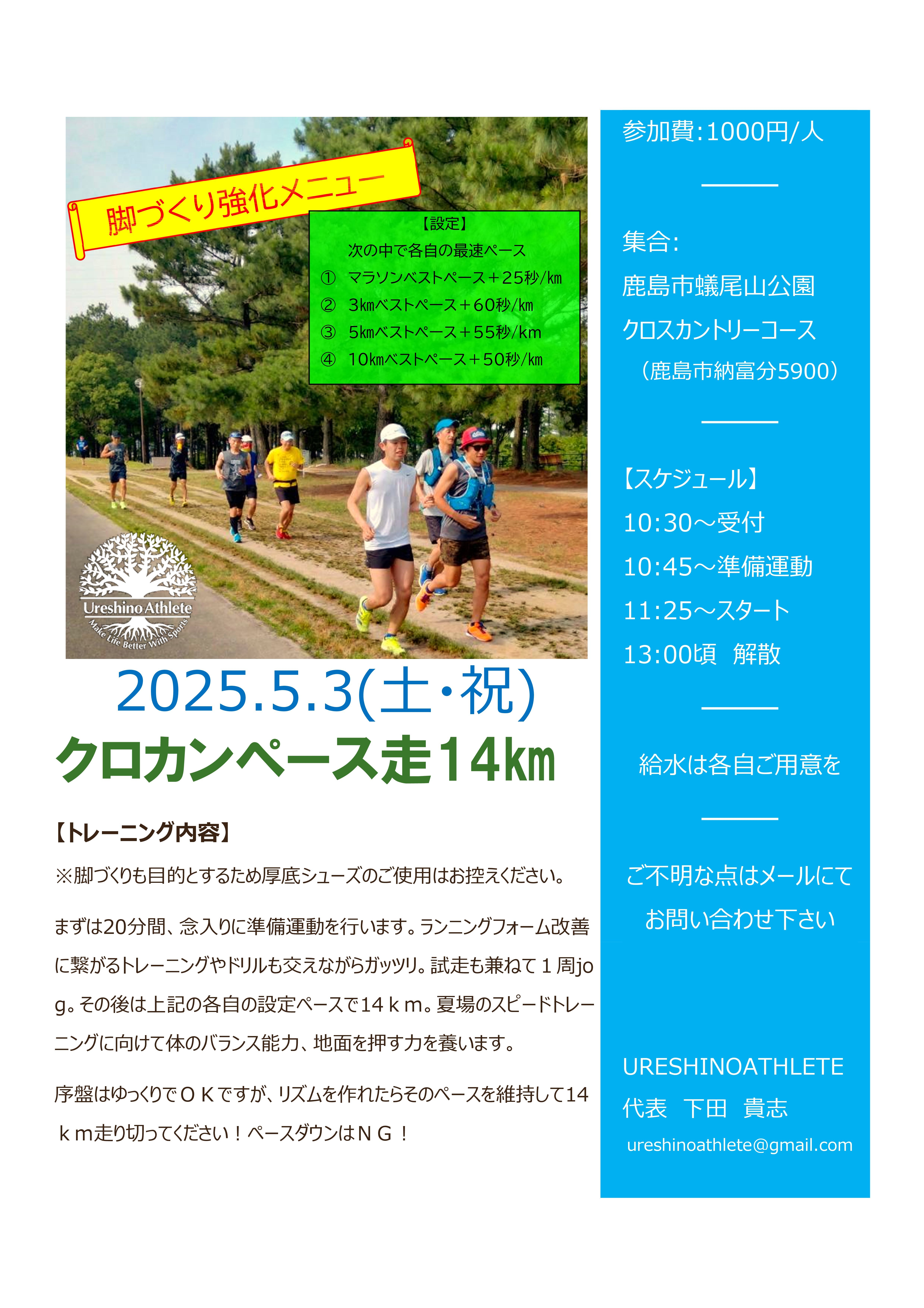 来シーズンに向けて5月から本格的に動き出しましょう!今回は低負荷ながらも脚筋力を追い込める「クロカンペース走14km」を開催します。