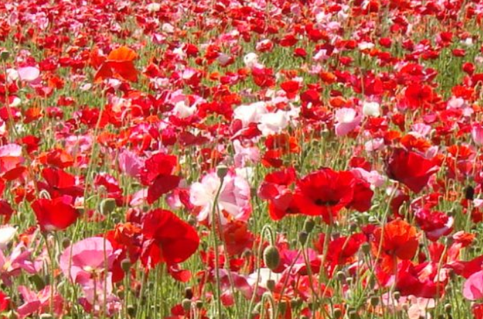 真っ赤なポピーが5000㎡もの農場一面に咲き誇るさまは夢心地になる事でしょう。春風に揺れ動くさまはポピーの美しさを競い合ってるように見えます。