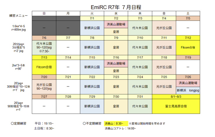 7/30(水) 20'jog+90秒間走*8~10本 r=1’ 動き作り有り: -