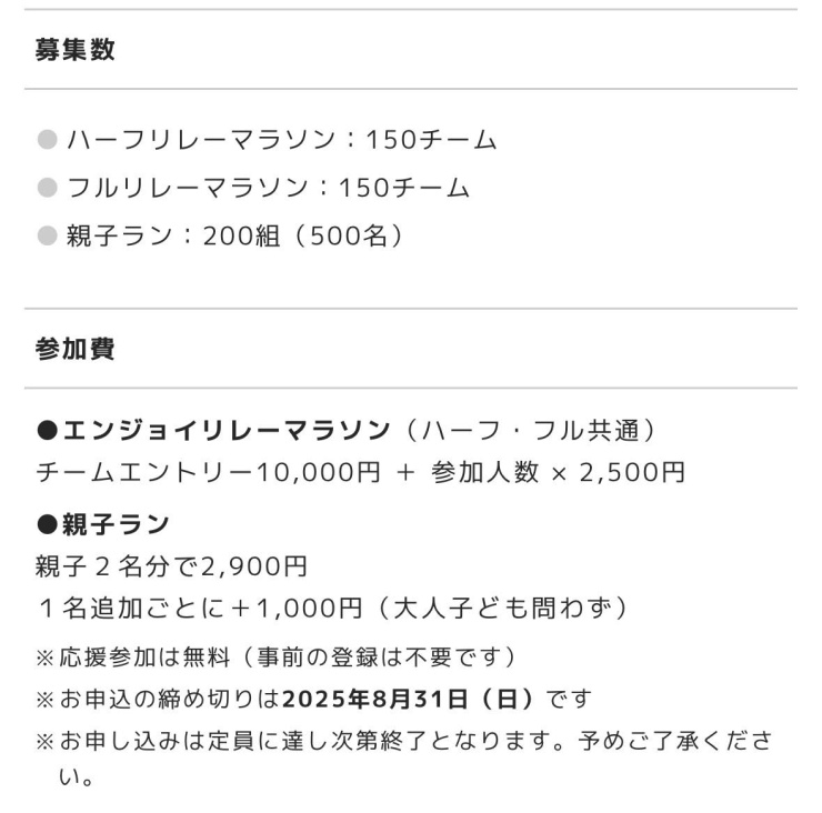 - ランニング(種目:フル、ハーフ、30km走、ウルトラ、駅伝・リレー、親子・キッズ、その他 )