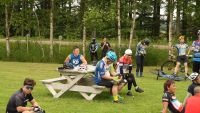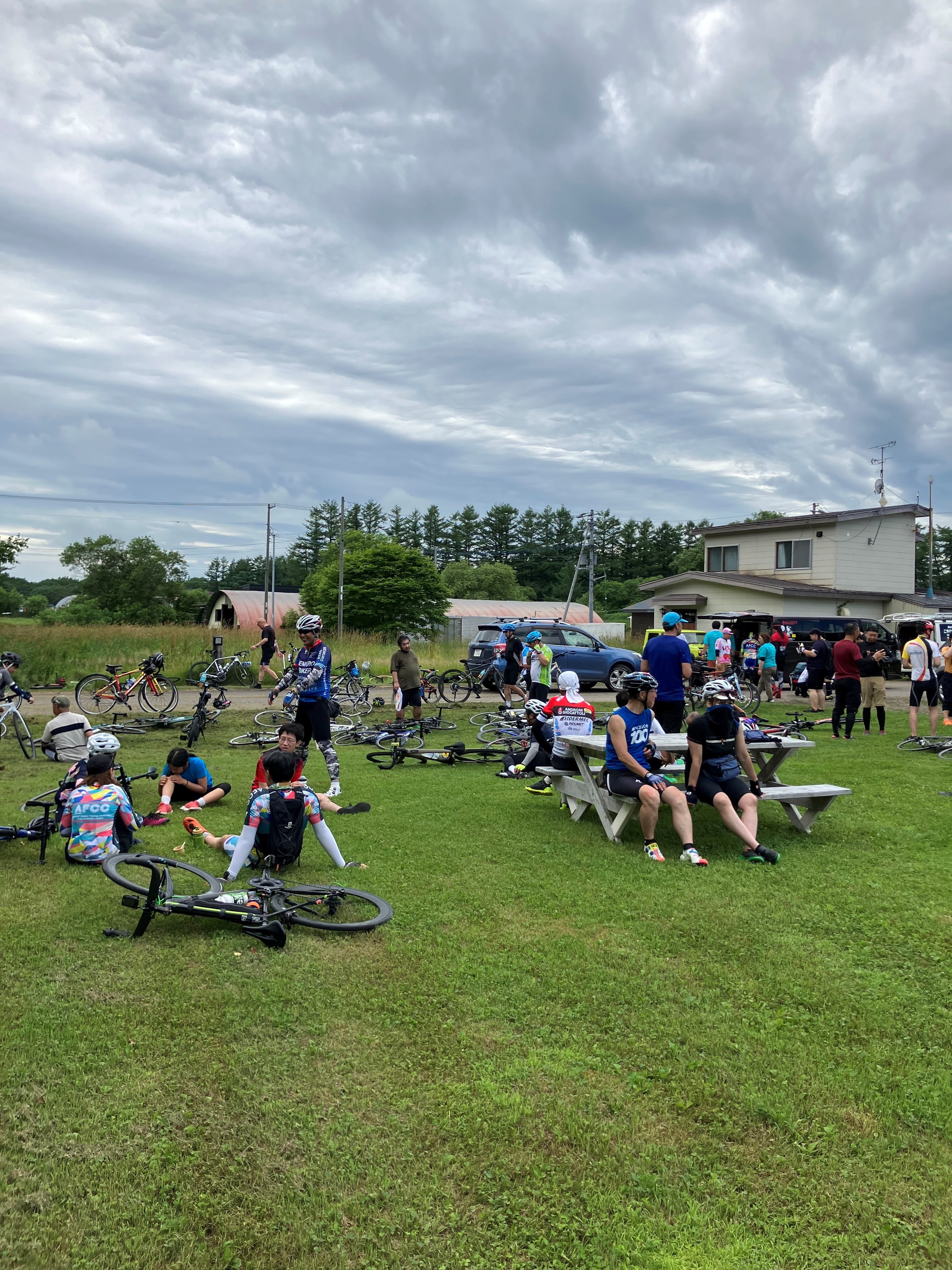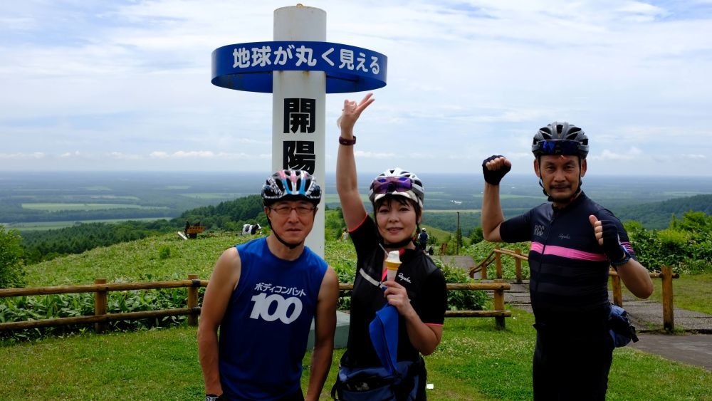 最初の目的地は、中標津町の観光名所『開陽台』です。スタート地点から開陽台までの道のりは、徐々に緩やかな上り坂が続きます。特に、開陽台到着直前の激しいアップダウンはなかなかの挑戦でしたが、子どもも大人も力を振り絞って乗り越え、無事第1エイドステーションの『開陽台』に到着。そこで待ち受けていたのは、絶品の『カフェカイヨウダイ』のソフトクリーム。甘さと冷たさでエネルギーを補充し、広大な地平線(330°の景色)を楽しみました。
