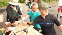 『牧舎』では、地元の飲食店が提供する弁当で昼食をいただきました。弁当には大きな鮭が入り、北海道を感じる味わいに皆笑顔に。協賛企業からの麦茶も提供され、熱中症対策も万全です。