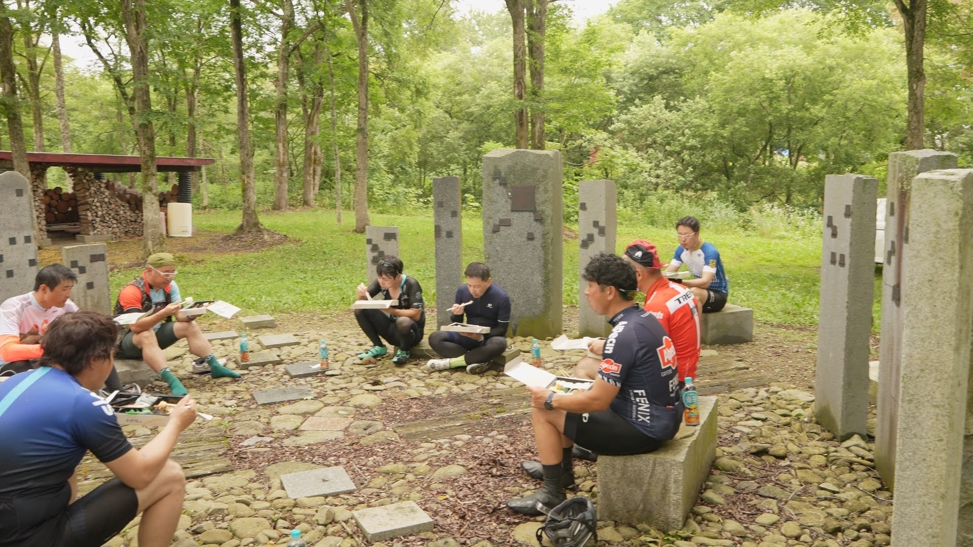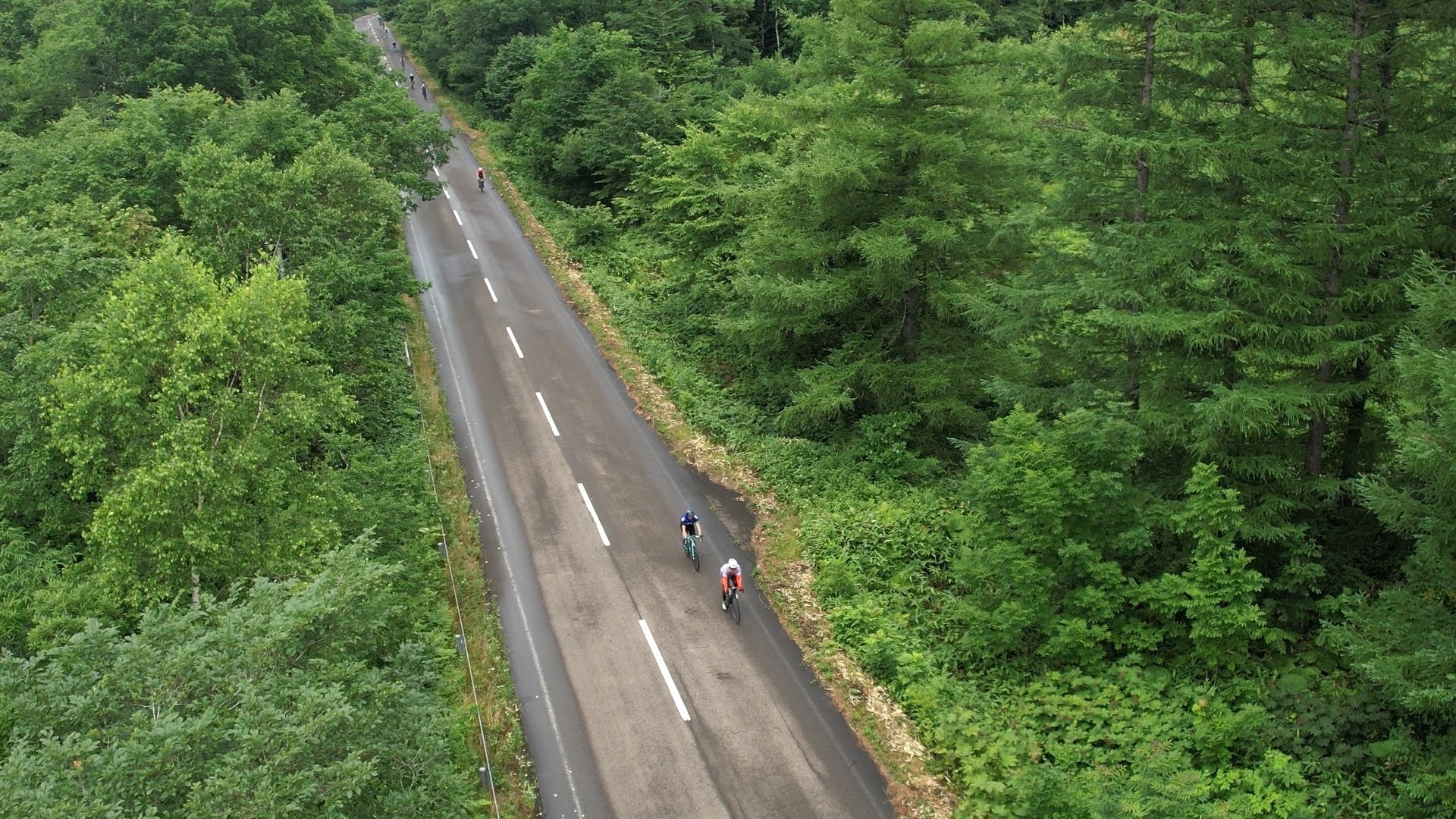 開陽台から第2エイドステーションの『牧舎』へ向かう途中、雨が止み、曇り空の中に徐々に青空が見えてきました。気分も晴れてきて、青空に向かって快調にペダルを漕いでいきます。