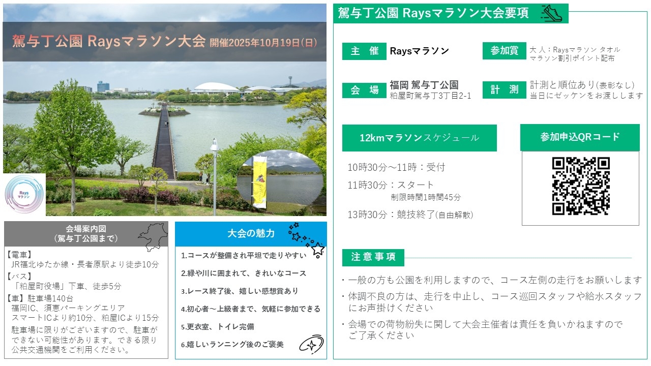 駕与丁公園 Raysマラソンを10月19日(日)に開催します。種目は、12kmになります。マラソンこれから初めてみようかな、マラソン大会のリハーサル練習、日頃の練習の成果を確認したい、他のランナーさんから刺激を受けたいなど初心者から上級者の方まで楽しめる大会です。一緒にきれいな緑と湖の景色を見ながら楽しみましょう。