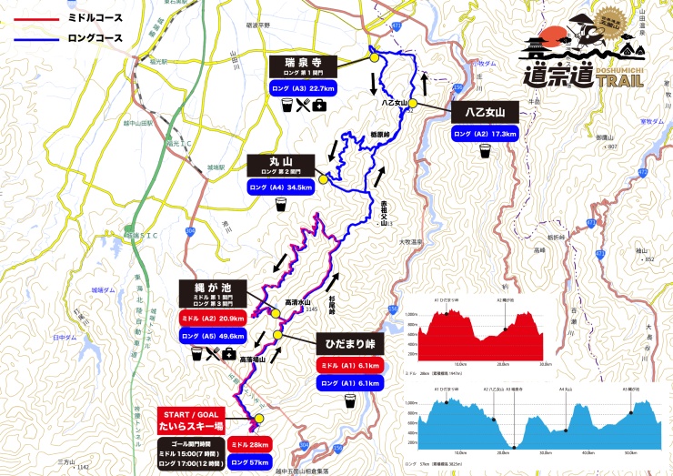 世界遺産・五箇山の自然と歴史を舞台に、富山県南砺市で開催されるトレイルラン大会。たいらスキー場発着の、ロング57km・ミドル28kmの2種目を実施します。