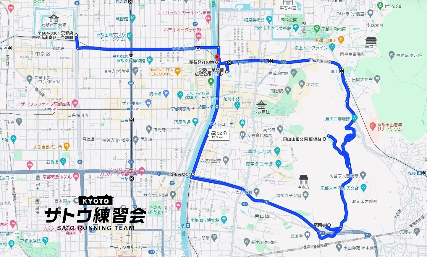 二条城→三条大橋→九条峠→東山山頂公園→清水五条→鴨川→三条大橋→二条城(解散)