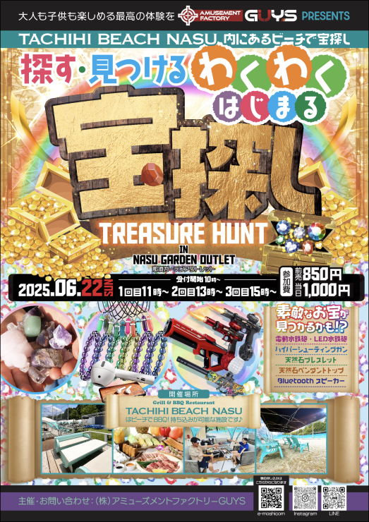 那須ガーデンアウトレット内にあるグリル&BBQ TACHIHI BEACH NASUのビーチにて宝探し大会を開催します。