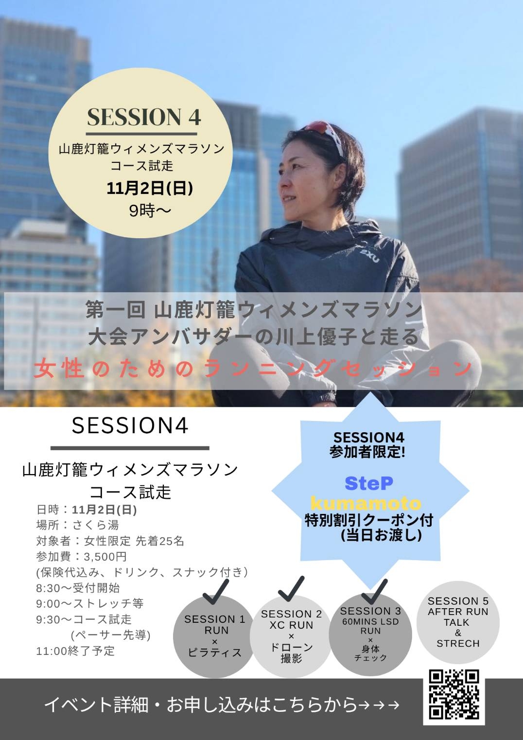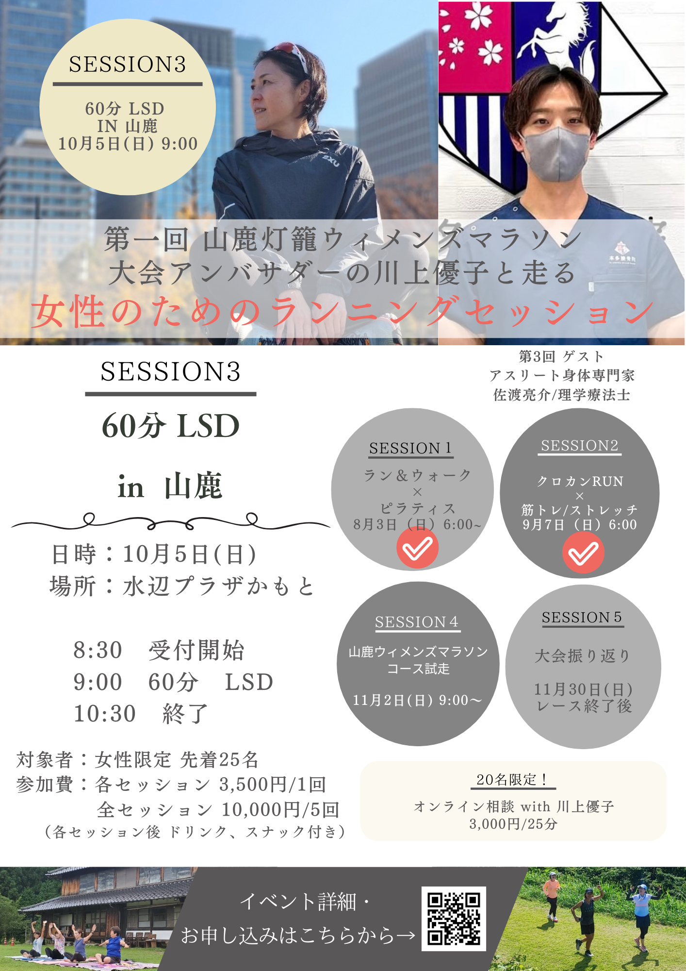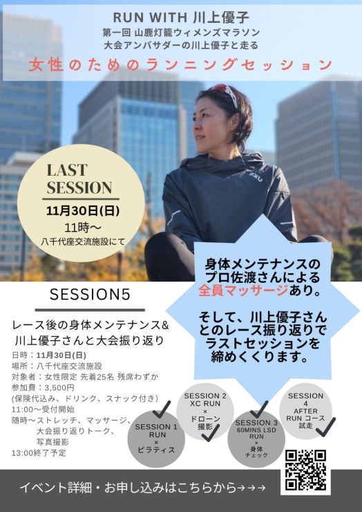 *Yuko Kawakami a representative of the Japan team in the past two Olympics and a former head coach of the professional running team, will have an opportunity to directly discuss your running-related problems, such as training, stretching and injury prevention.