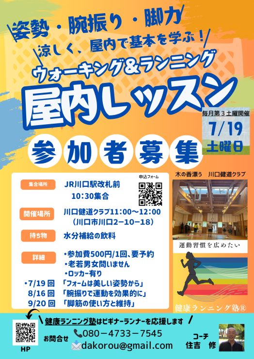 7/19は姿勢、8/16は腕振り、9/20は脚力の3回トータルレッスンです。毎月第3土曜日開催。
