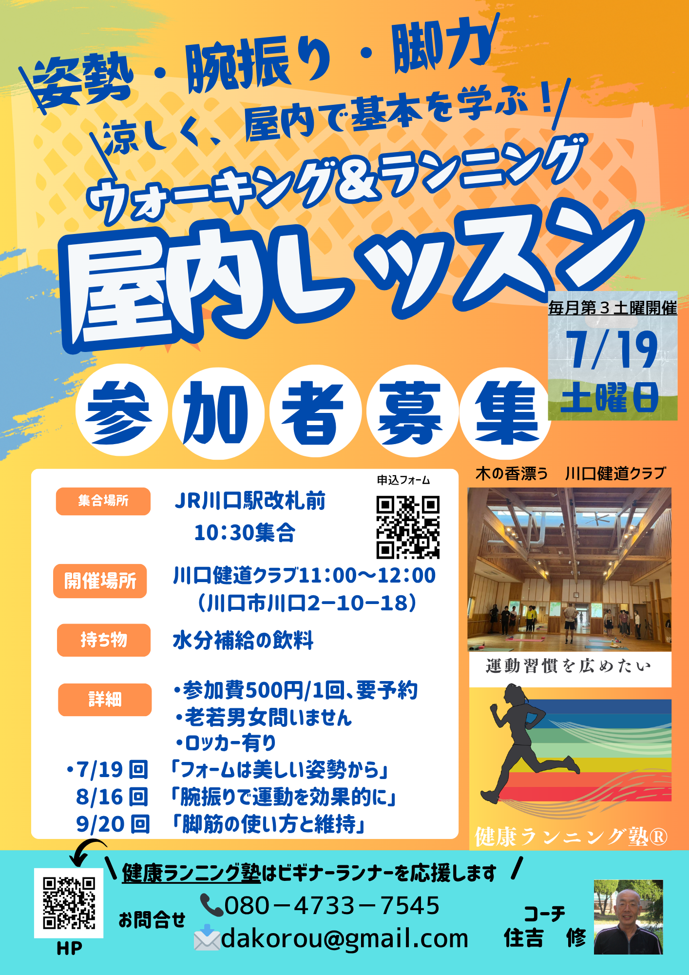 いつもは川口市青木公園の周回コースでの無料体験会ですが、7~9月は暑さを避け屋内で実施します(有料500円)。涼しい環境でカラダを動かしましょう。