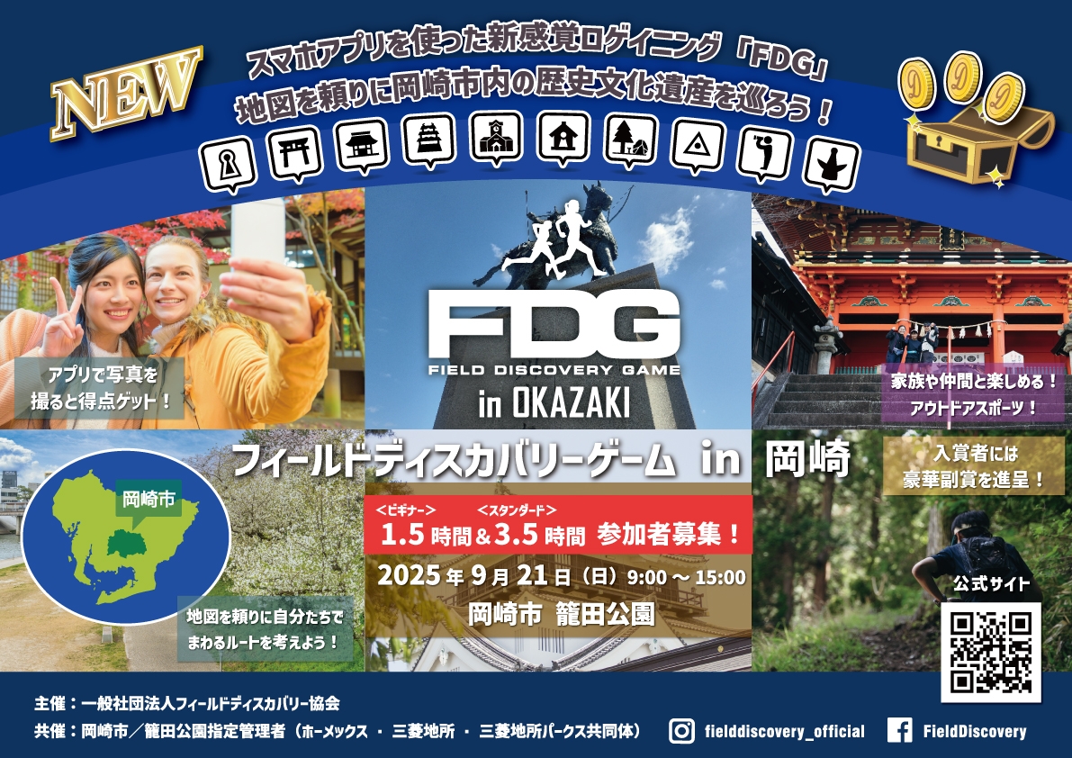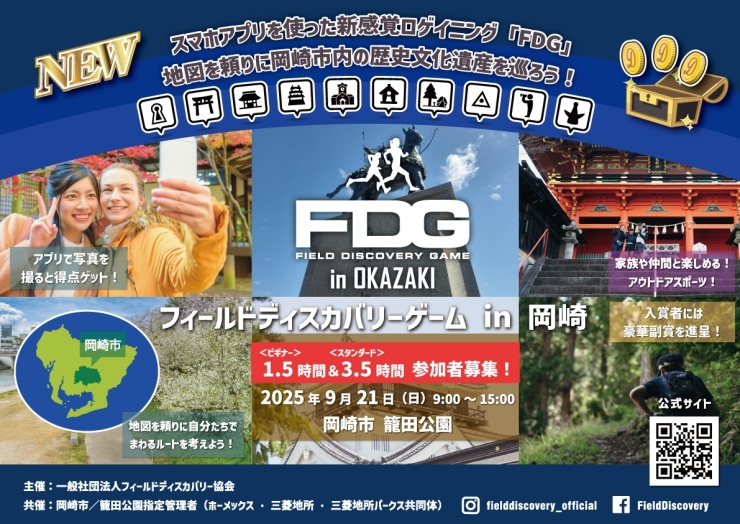 FDG(フィールドディスカバリーゲーム)は、スマホ専用アプリを用い、歴史・文化遺産に設定されたスポットを巡り、制限時間内に得られたスコアで順位を競う「アウトドアeスポーツ」。徳川家康生誕の地、天下統一の基礎を固めた城として知られる岡崎城の城下町「岡崎市」。岡崎の知られざる歴史と文化をフィールドディスカバリーしよう!ビギナー1.5時間とスタンダード3.5時間の2部門を開催!
