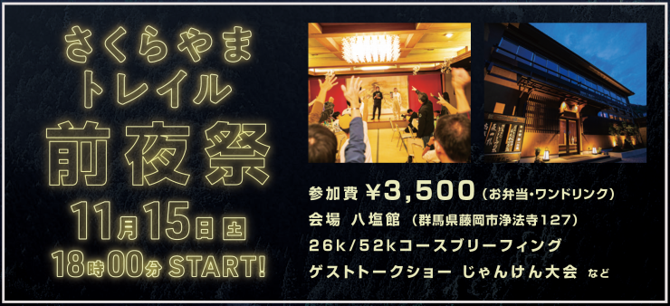 ■内容:ゲストランナー吉野 大和 選手・板橋 黎華 選手・板橋 美紀 選手のトークショーや26k/52kコースのコースブリーフィング、協賛企業様プレゼンツのじゃんけん大会などなど!ゲストとの交流やトレイルラン仲間とレース前の情報交換に最高の夜を準備いたします。