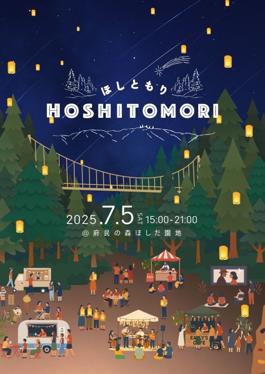 “ほしともり”は生駒の自然に囲まれた、ほしだの森でひらくナイトマーケット。おいしい食事を片手に、音楽やナイトシネマ、忙しい日常から離れていつもと違う特別な一夜限りの時間。“ちょっと特別な夜”を味わいに来ませんか?