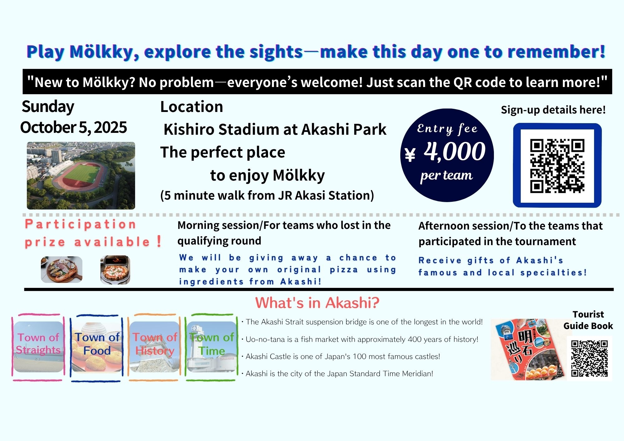 Join us for a friendly and fun Molkky event at Akashi Park-just steps from JR Akashi Station!open to all international guests welcome!