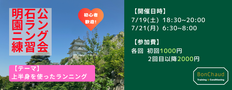 明石の山陽電鉄西新町駅前にあるパーソナルトレーニングジムBonChaud(ボンショウ)が主催するランニングイベントです。