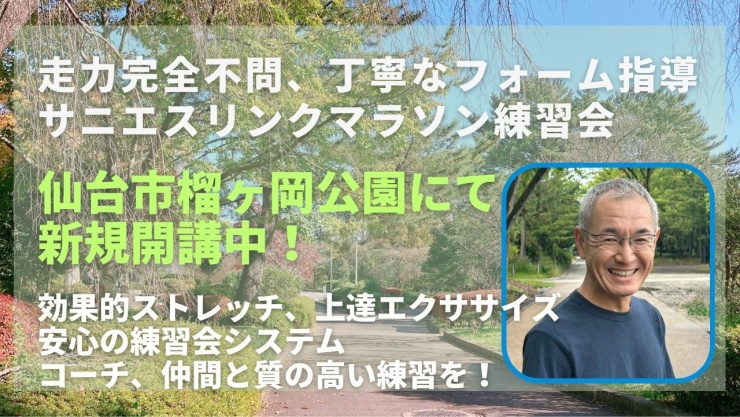 関東ですでに実績のある走力完全不問のランニングクラブ、サニエスリンクです。安心の練習システム、身体の仕組みをうまく使った専門的なストレッチやエクササイズ、フォーム指導に定評があります。今まで関東エリアをメインに練習会を運営していましたが、2025年9月より、仙台市榴岡公園/楽天モバイルパークでも練習会を新規スタートしました!ぜひご参加ください!