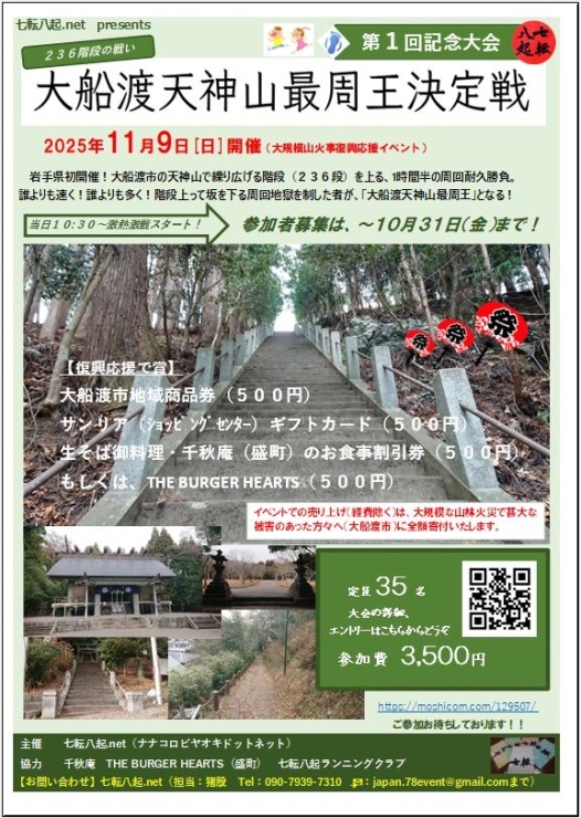 きつい!楽しい!苦しい!やっぱり楽しい!236段ある急で狭い階段、凸凹ばかりの下り坂、危険な周回地獄を攻略し、大船渡天神山最周王の称号を勝ち取るのはあなたです。
