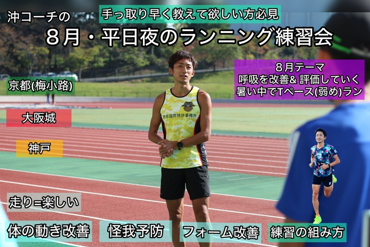 沖コーチの主催する2025年8平日のランニングセミナーです。京都・大阪城・神戸の教室を紹介しています。時期に応じた・レベルに合わせた努力が身を結ぶ指導やコーチングを提供します。