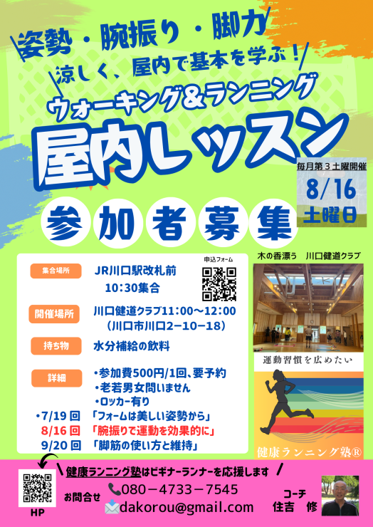 いつもは川口市青木公園の周回コースでの無料体験会ですが、7~9月は暑さを避け屋内で実施します(有料500円)。涼しい環境でカラダを動かしましょう。
