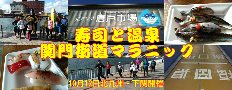 小倉駅から門司港駅までの北九州マラソン後半コースを走り、関門トンネル人道を抜け県境を越え、下関『唐戸市場』で美味しいお寿司を食べて休憩、ゴール地点の温泉「照葉スパリゾート門司店」を目指します(全26km)。