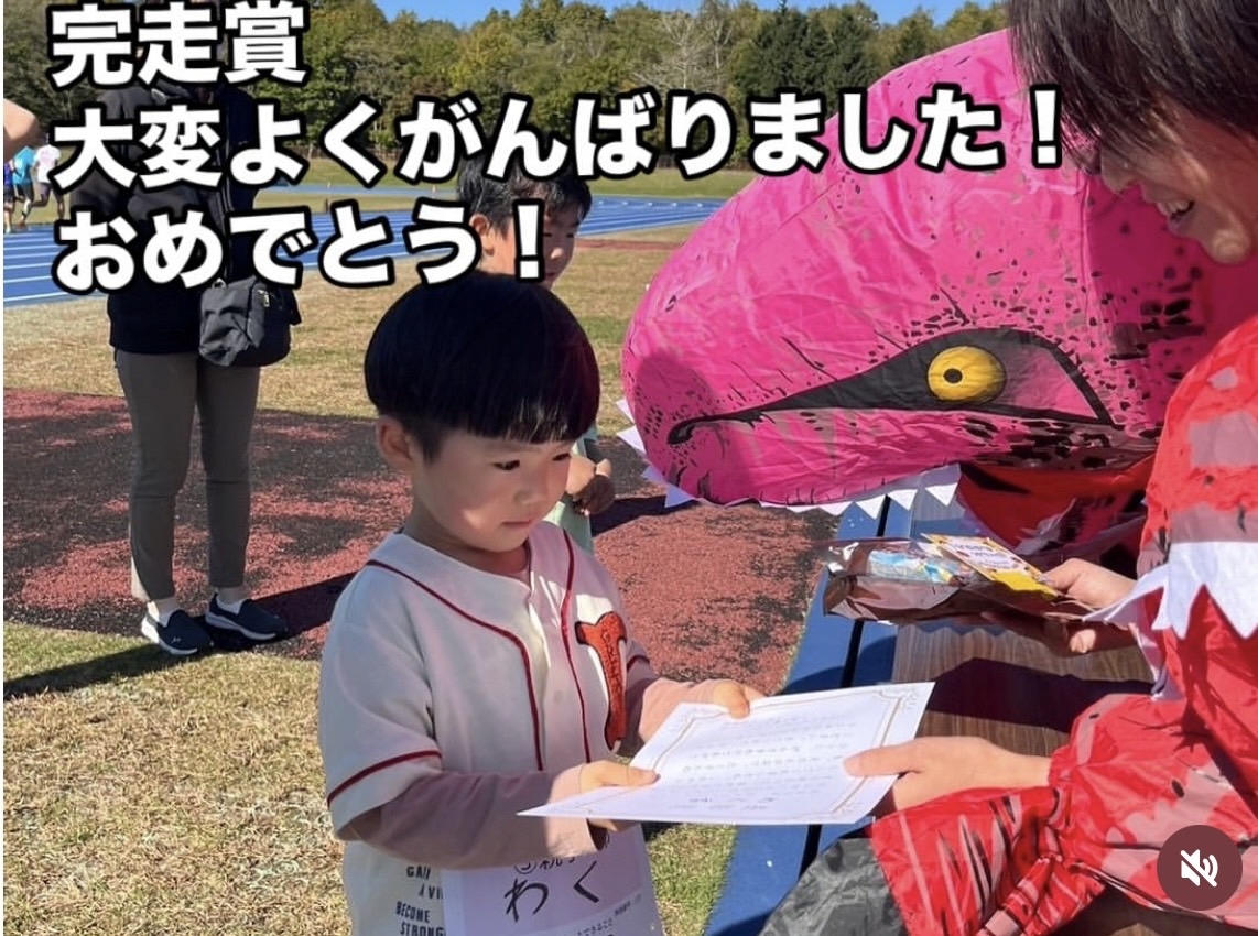 - ①親子の部、ウオーキングの部…体操、恐竜鬼ごっこでウオーミングアップ ②ランニングの部…体操、ウオーミングアップ、100m×3本流し