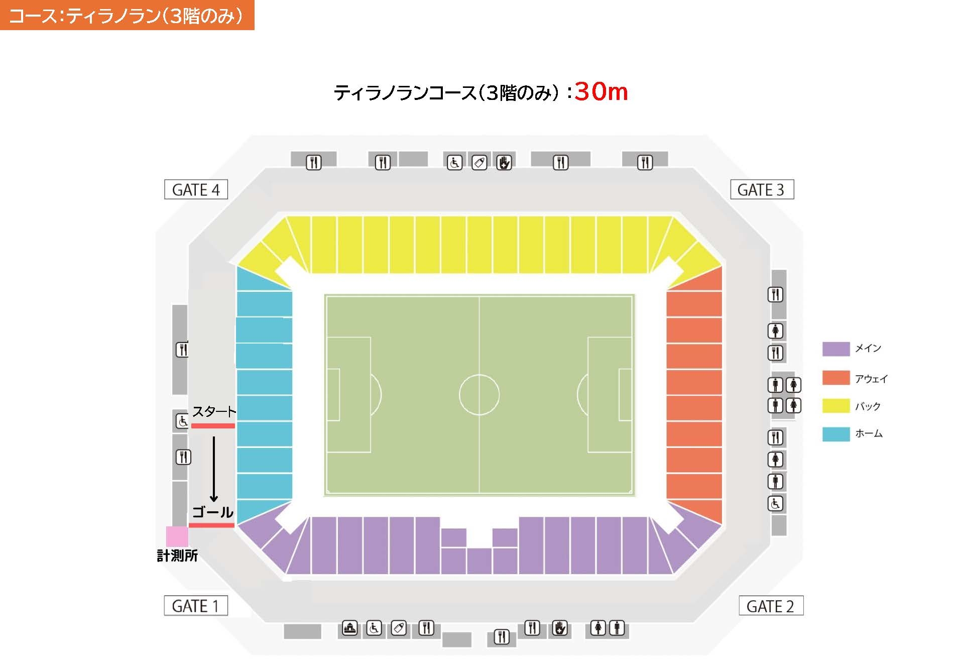 ティラノランは、最大25名を募集しています。雨風に左右されない「パナソニックスタジアム吹田」の3階に30m直線コースをご用意いたします。完走者には、完走メダル・完走証をご用意しております。