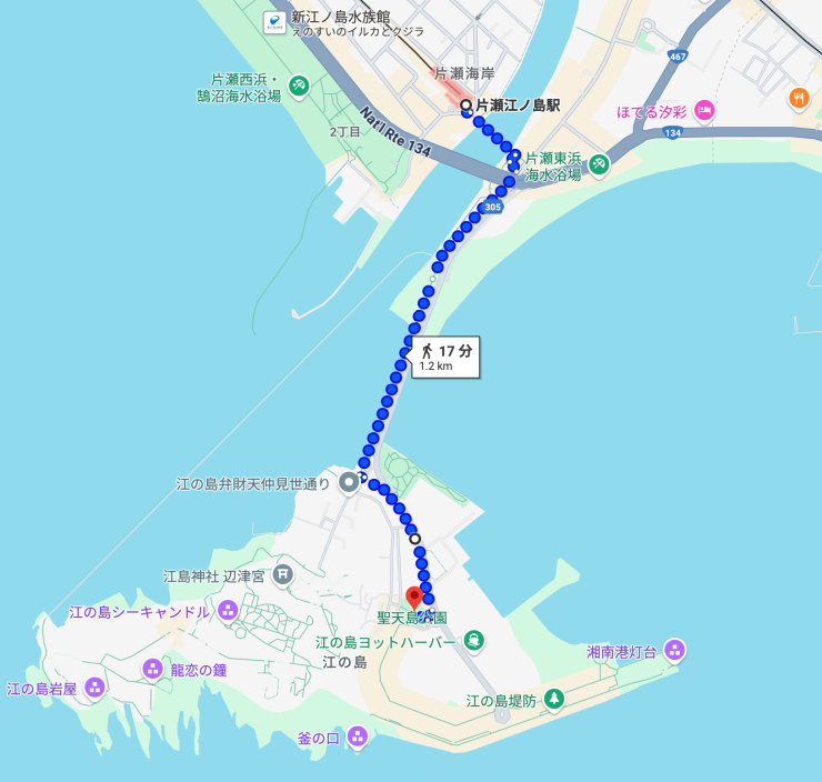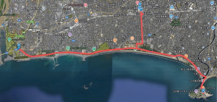 ※江ノ島聖天島公園→134号茅ヶ崎方面→柳島スポーツ公園(折返し)→134号辻堂方面→テラモール湘南