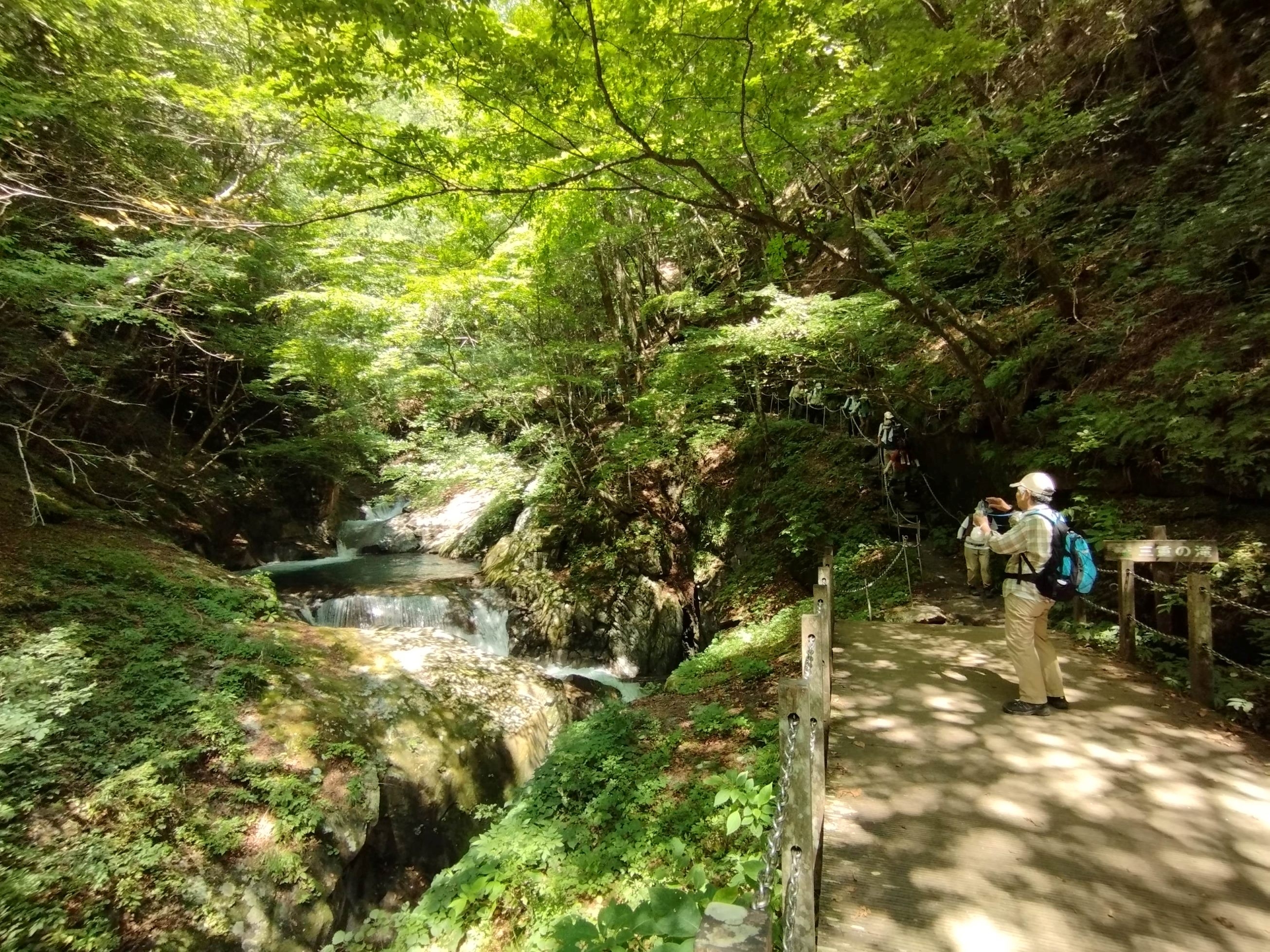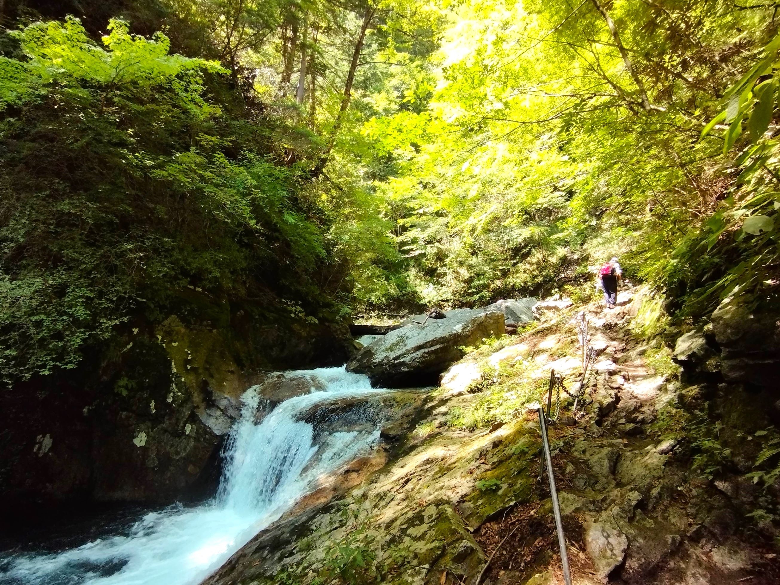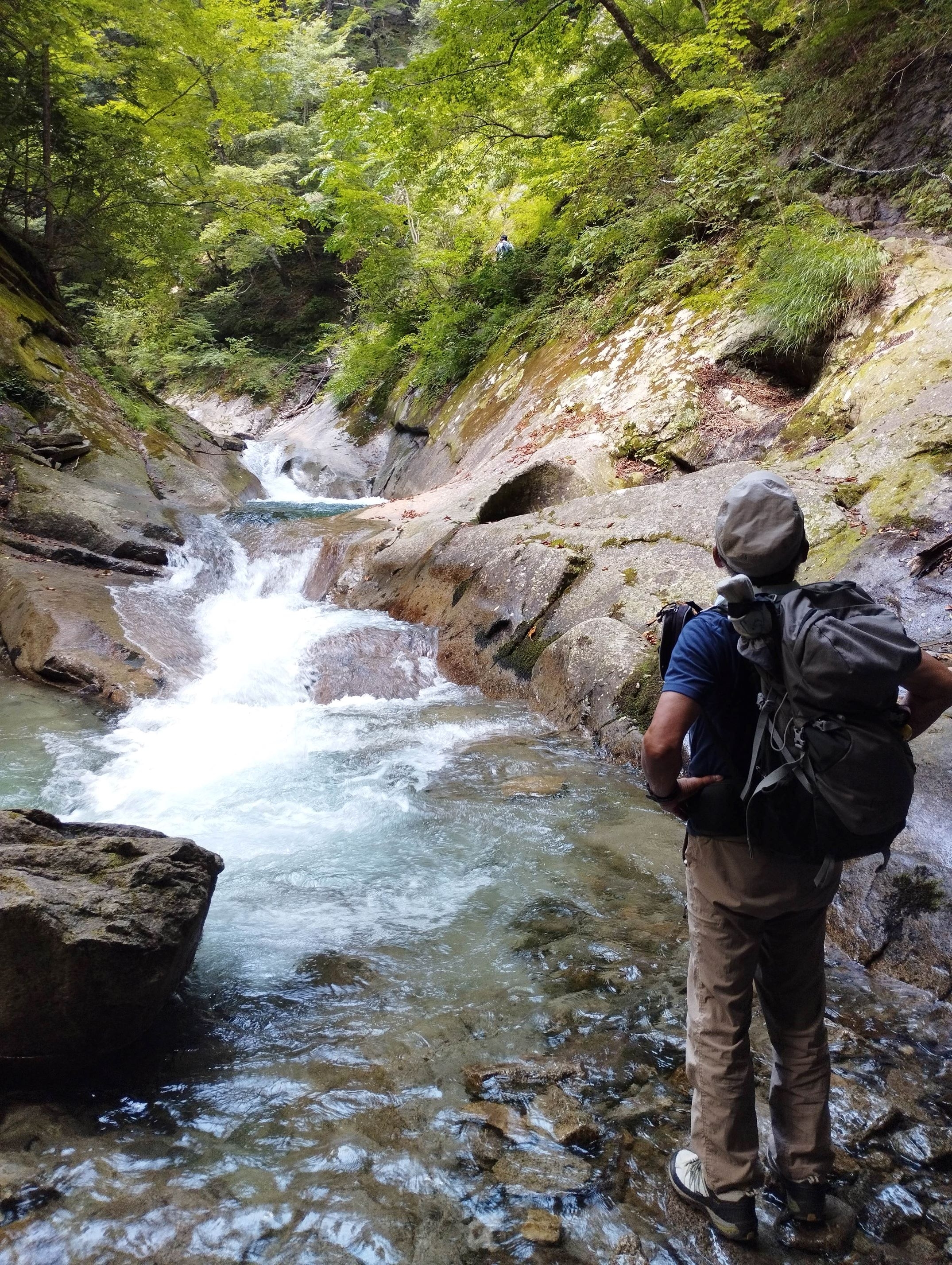 暑さのあまり運動不足の面々が久々の山あるきへ。登りの岩場は滑りやすかったり急だったり段差が大きかったり、と所々大変なところもありましたが、木々の緑と水の碧と、眼にも耳にも涼しい渓谷あるきでした。