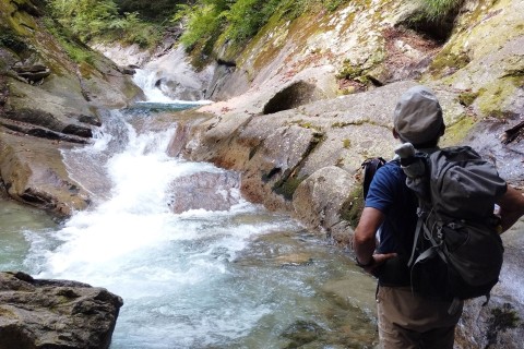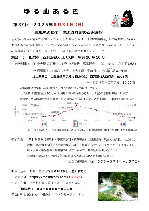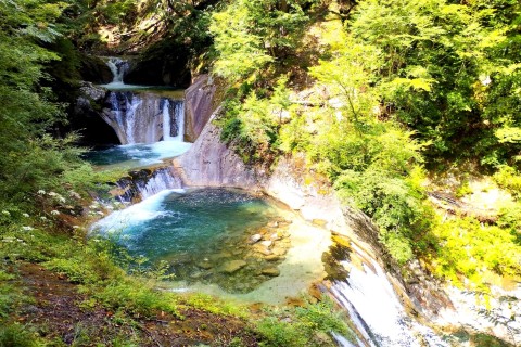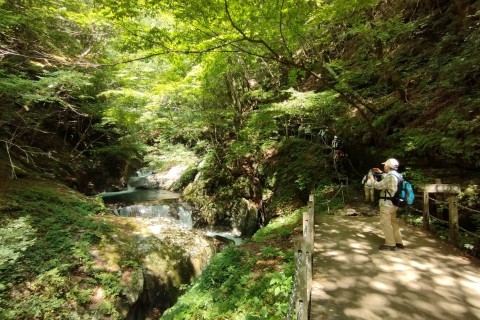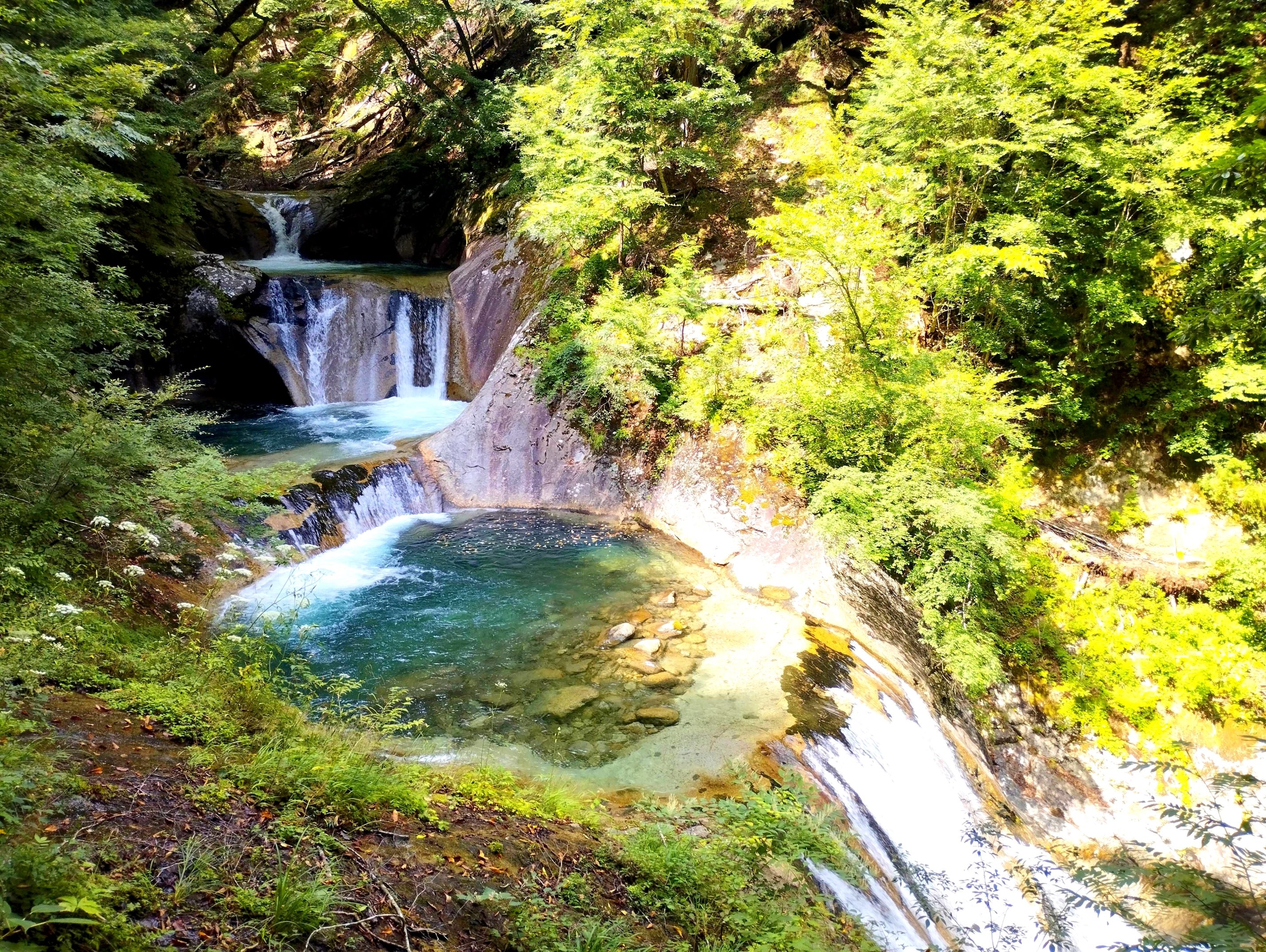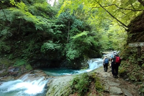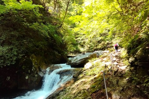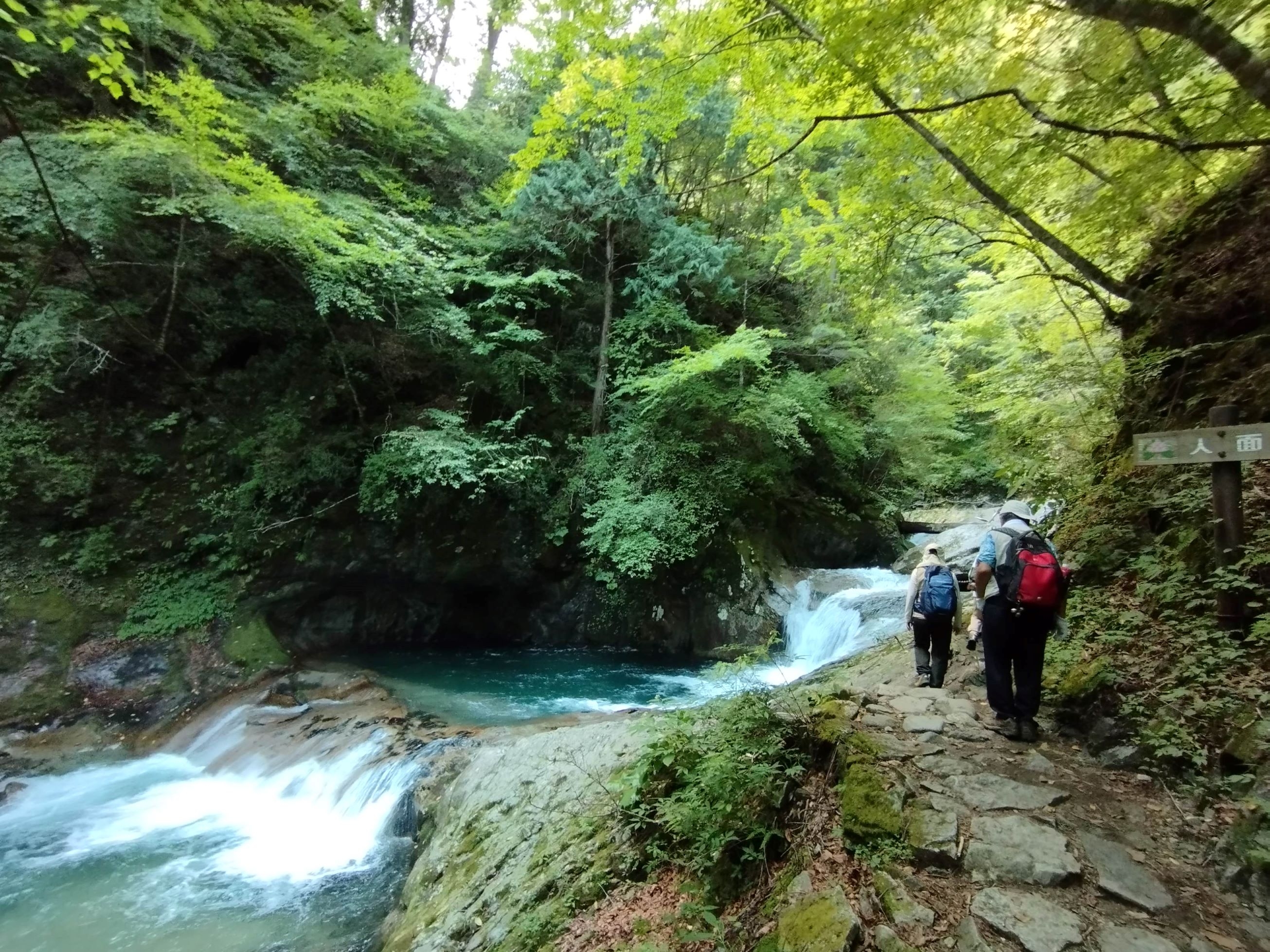 暑さのあまり運動不足の面々が久々の山あるきへ。登りの岩場は滑りやすかったり急だったり段差が大きかったり、と所々大変なところもありましたが、木々の緑と水の碧と、眼にも耳にも涼しい渓谷あるきでした。