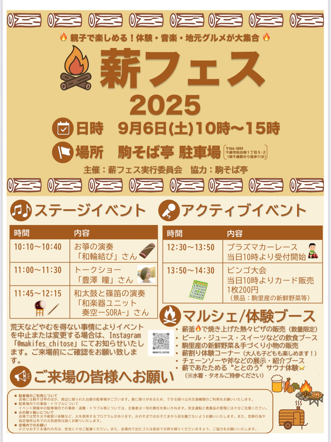 当日は、豊澤瞳さん(&sauna出演)のトークショーやお箏演奏、太鼓と篠笛の演舞、プラズマカーレース、ビンゴ大会などイベントも盛りだくさん。薪釜ピザやスイーツ、ビール、駒里産の新鮮野菜など、地元グルメも勢揃いします。
