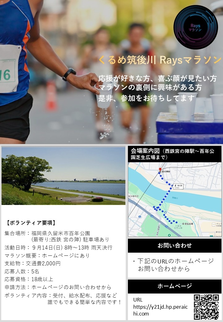 くるめ筑後川 Raysマラソン大会のボランティア・アルバイトを募集しております。詳しい要項は、ホームページで案内しております。