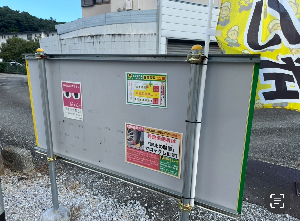 駐車場は写真の位置に一日200円でとめることができるコインパーキングがあります。11台とめれます。