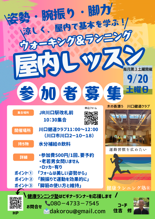 いつもは川口市青木公園の周回コースでの無料体験会ですが、7~9月は暑さを避け屋内で実施します(有料500円)。涼しい環境でカラダを動かしましょう。