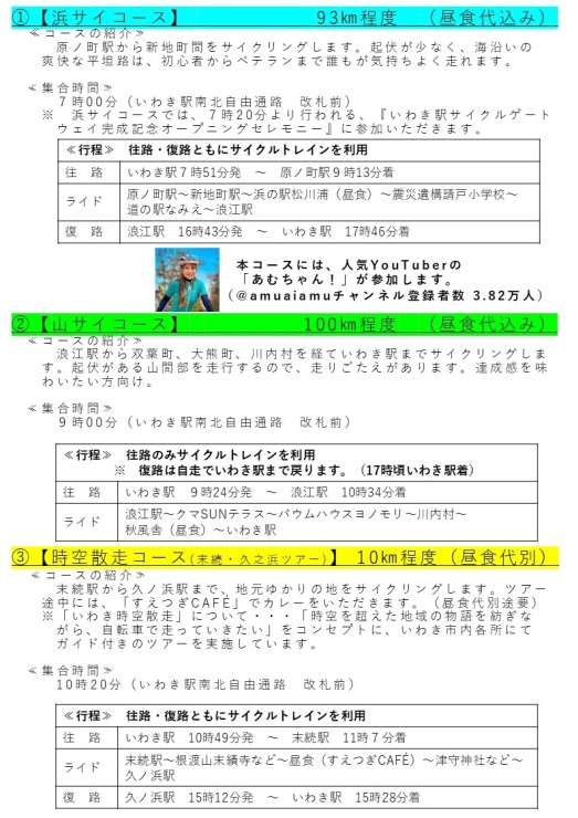 コースは、現在実証実験中の「常磐線浜通りサイクルトレイン」を活用し、「浜サイコース」、「山サイコース」、「時空散走」の3つ。「浜サイコース」には、自転車ユーチューバー「あむちゃん!」が参加。