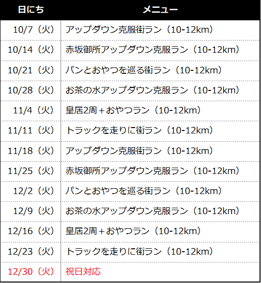 これからフルやハーフマラソンに挑戦したい方、フル5時間30分や5時間目標の方対象の火曜午前中のランニング教室です。マラソン練習って何から始めたらいいんだろう、、、秋冬のレースエントリーした方!走りましょう!一人じゃ難しいけどみんなとなら!週1回のトレーニングを一緒にがんばってみませんか?過去にトライアルに申込みされた方もお申込み可能です。【初フルマラソン サブ5 街ラン】