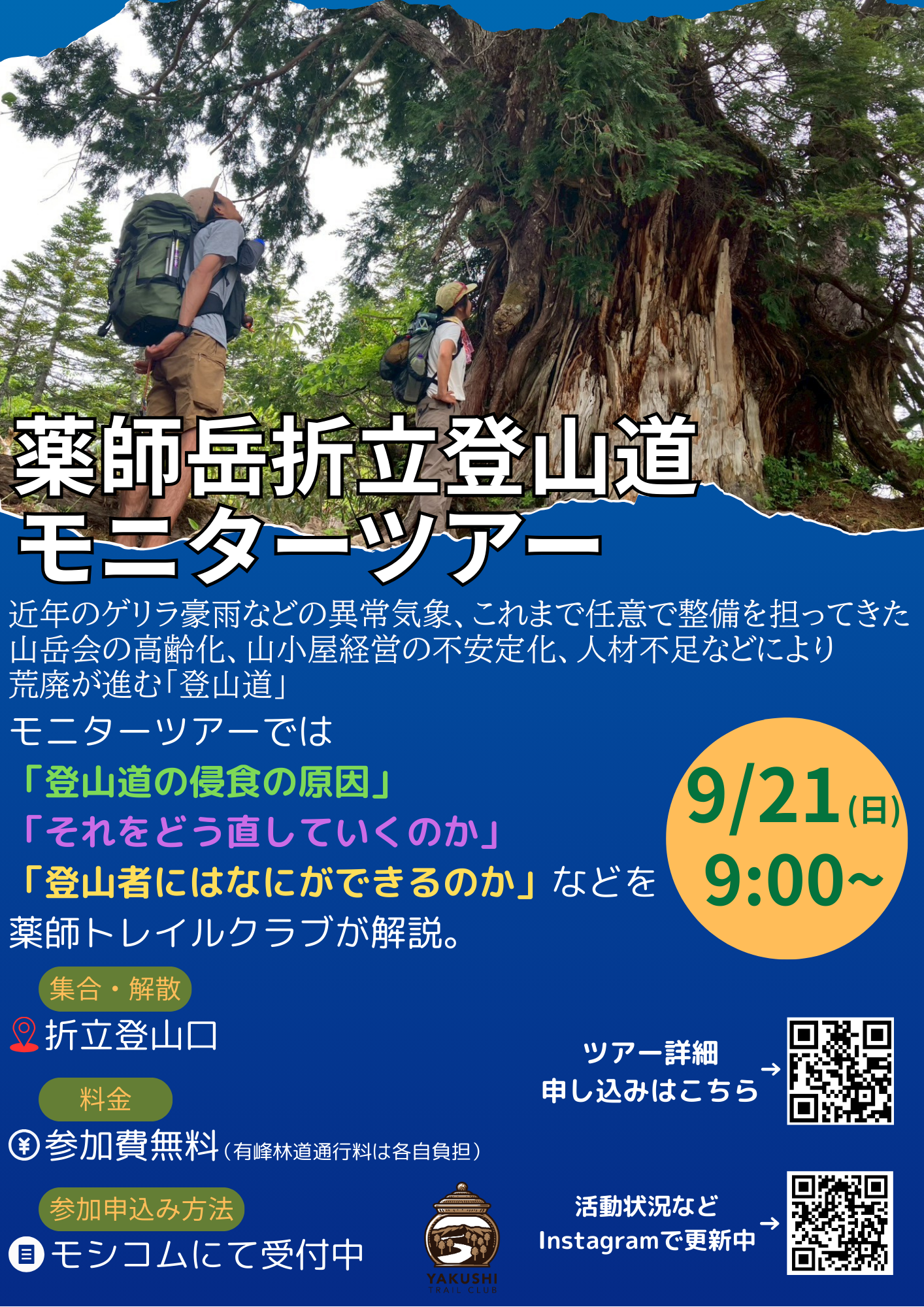 こちらでは「モニターツアー」や「登山道整備会」の案内、募集を行っています。