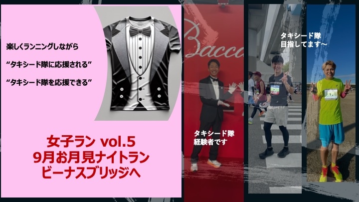 おもてなしタキシード隊を目指す男性スタッフがサポートし、笑顔で頑張る女性ランナーを全力で応援します。