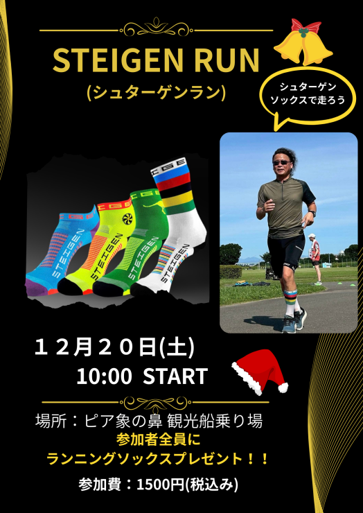 今回の特典は参加者にシュターゲンソックスを贈呈!体操+ラン約5Kmを行います。クリスマスバージョンのソックスもご用意しております。サンタ帽子もかぶり、STEIGENソックスを直接履いて、クリスマス気分で走りましょう!