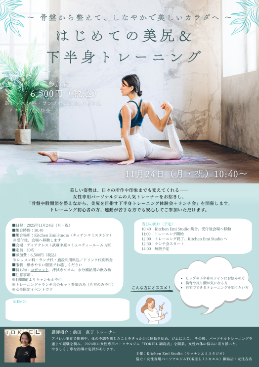 女性専用パーソナルジムの人気トレーナーをお招きし、「骨盤や股関節を整えながら、美尻を目指す下半身トレーニング体験会+ランチ会」を開催します。