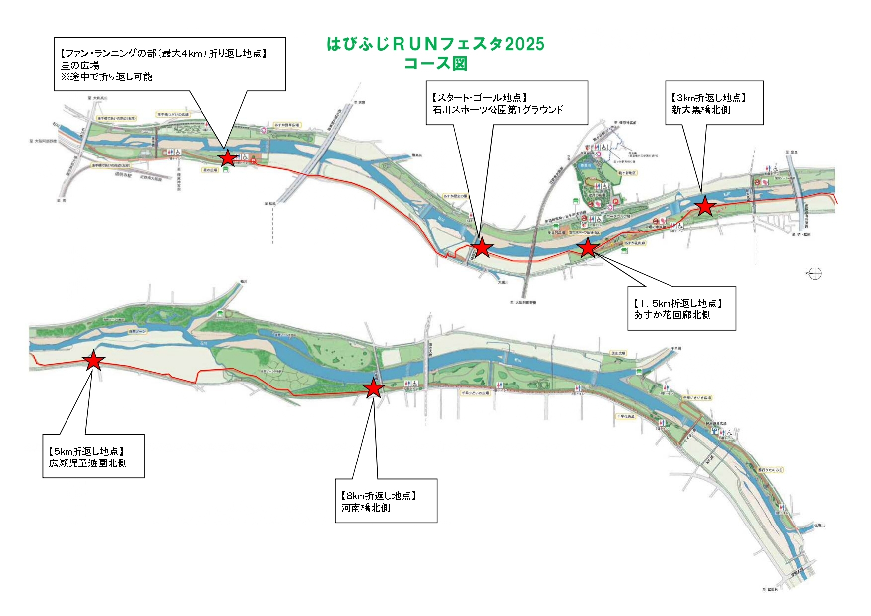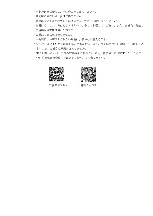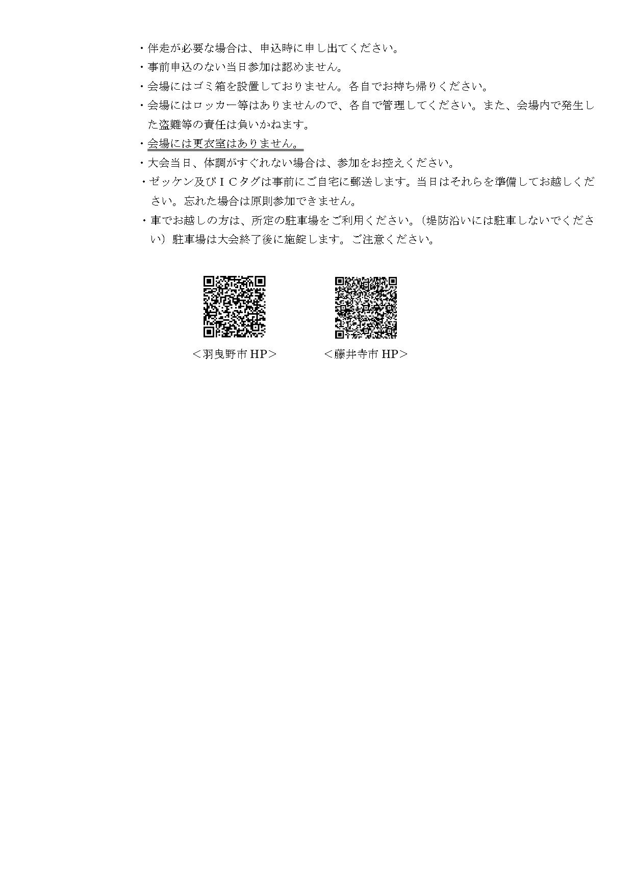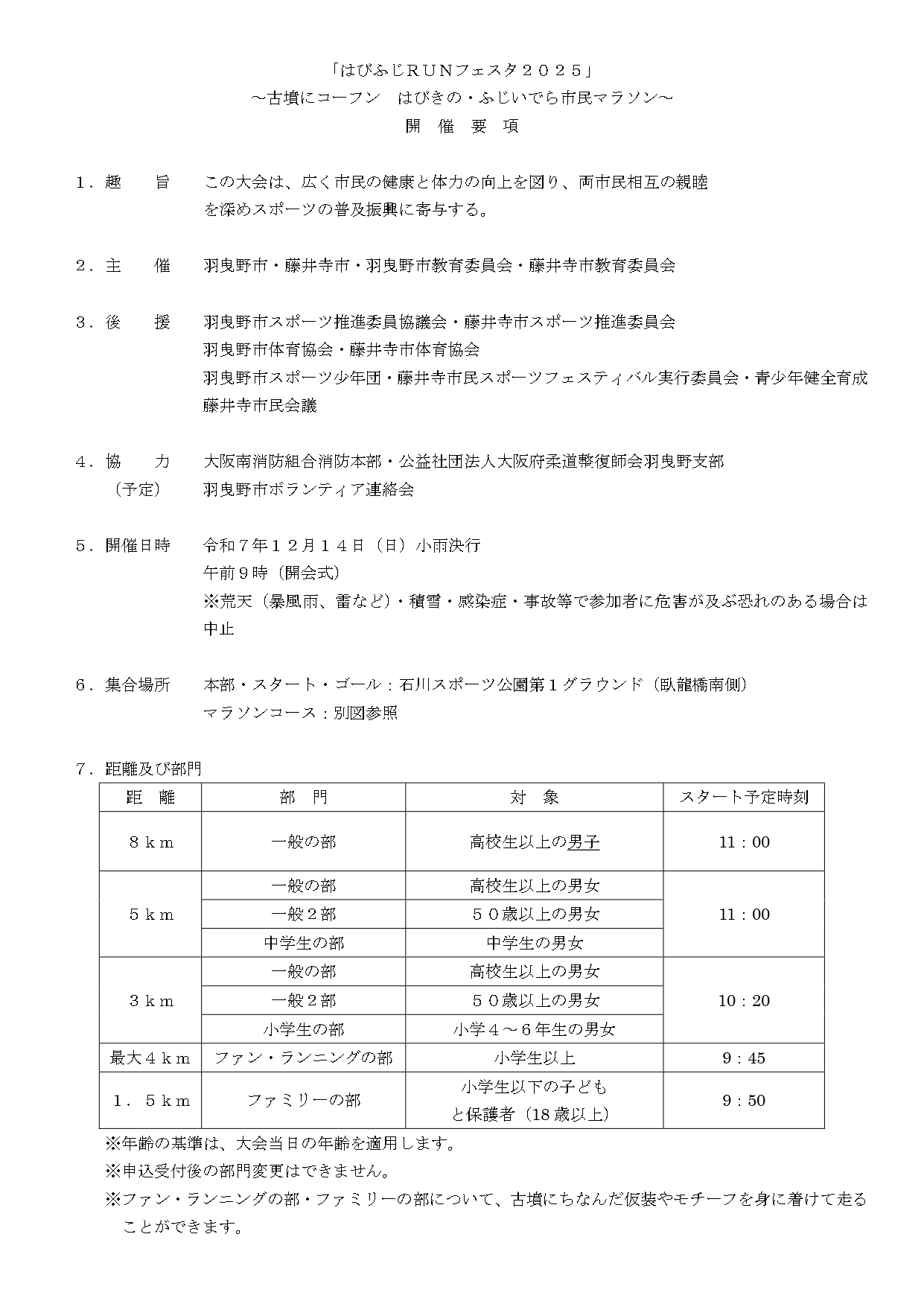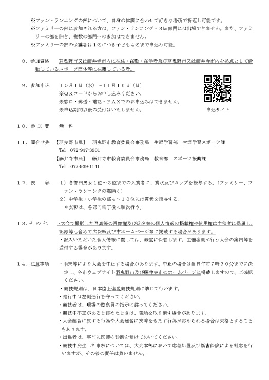 【開催要項】 ①趣旨 この大会は、広く市民の健康と体力の向上を図り、両市民相互の親睦を深めスポーツの普及振興に寄与する ②主催 羽曳野市・藤井寺市・羽曳野市教育委員会・藤井寺市教育委員会 ③後援 羽曳野市スポーツ推進委員協議会・藤井寺市スポーツ推進委員会 羽曳野市体育協会・藤井寺市体育協会 羽曳野市スポーツ少年団・藤井寺市民スポーツフェスティバル実行委員会・青少年健全育成藤井寺市民会議 ④協力 大阪南消防組合消防本部・公益社団法人大阪府柔道整復師会羽曳野支部 羽曳野市ボランティア連絡会 ⑤開催日時 令和7年12月14日(日)小雨決行 午前9時(開会式) ※荒天(暴風雨、雷など)・積雪・感染症・事故等で参加者に危害が及ぶ恐れのある場合は中止 ⑥集合場所 本部・スタート・ゴール:石川スポーツ公園第1グラウンド(臥龍橋南側) マラソンコース:市のHPより参照 ⑦距離及び部門 画像より参照 ※年齢の基準は、大会当日の年齢を適用します。 ※申込受付後の部門変更はできません。 ※ファン・ランニングの部・ファミリーの部について、古墳にちなんだ仮装やモチーフを身に着けて走ることができます。 ※ファン・ランニングの部について、自身の体調に合わせて好きな場所で折返し可能です。 ※ファミリーの部に参加される方は、ファン・ランニング・3km部門には出場できません。 ※ファミリーの部の保護者は1名につき子ども4名まで申込み可能。 ⑧参加資格 羽曳野市又は藤井寺市内に在住・在勤・在学者及び羽曳野市又は藤井寺市内を拠点として活動しているスポーツ団体等に在籍している者。 ⑨参加申込 10月1日(水)~11月16日(日) ※QRコードからお申し込みください。 ※窓口・郵送・電話・FAXでのお申込みはできません。 ※申込期間以後の受付はいたしません。 ⑩参 加 費 無 料 ⑪問合せ先 【羽曳野市民】 羽曳野市教育委員会事務局 生涯学習部 生涯学習スポーツ課 Tel:072-947-3901 【藤井寺市民】 藤井寺市教育委員会事務局 教育部 スポーツ振興課 Tel:072-939-1141 ⑫表彰 1)各部門男女1位~3位までの入賞者に、賞状及びカップを授与する。(ファミリー、ファン・ランニングの部除く) 2)中学生・小学生の部4~10位には賞状を授与する。 *表彰は、各部門終了後に順次行う。 ⑬その他 ・大会で撮影した写真等の肖像権及び氏名等の個人情報の掲載権や使用権は主催者に帰属し、記録等も含めて広報紙及び市ホームページ等に掲載する場合があります。 ・記入いただいた個人情報に関しては、厳重に保管します。主催者側が行う大会の案内等を送付する場合があります。 ⑭注意事項 ・雨天等により大会を中止する場合があります。中止の場合は当日午前7時30分までに決定し、各市ウェブサイト羽曳野市及び藤井寺市のホームページに掲載しますので、ご確認ください。 ・競技規則は、日本陸上連盟競技規則に準じて行います。 ・走行中は左側通行を守ってください。 ・競技者は、現場の監察員の指示に従ってください。 ・競技中不正があると認めたときは、着順を取り消す場合があります。 ・大会趣旨に反する行為や大会運営に支障をきたす行為が認められる場合は失格とすることもあります。 ・出場者は、事前に医師の診断を受けておいてください。 ・競技中発生した事故については、大会本部において応急処置及び傷害保険による対応を行いますが、その後の責任は負いません。 ・伴走が必要な場合は、申込時に申し出てください。 ・事前申込のない当日参加は認めません。 ・会場にはゴミ箱を設置しておりません。各自でお持ち帰りください。 ・会場にはロッカー等はありませんので、各自で管理してください。また、会場内で発生した盗難等の責任は負いかねます。 ・会場には更衣室はありません。 ・大会当日、体調がすぐれない場合は、参加をお控えください。 ・ゼッケン及びICタグは事前にご自宅に郵送します。当日はそれらを準備してお越しください。忘れた場合は原則参加できません。 ・車でお越しの方は、所定の駐車場をご利用ください。(堤防沿いには駐車しないでください)駐車場は大会終了後に施錠します。ご注意ください。