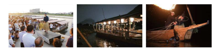 【付け見せ】停泊したままの観覧船から、鵜舟が順次川を下る様をご覧いただきます。