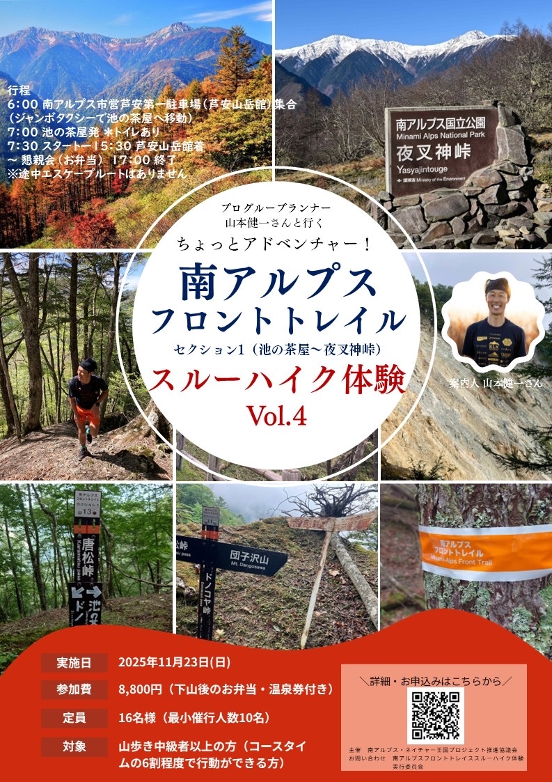 山梨県西部にある「南アルプスフロントトレイル」は、南アルプスの前衛、標高2000m前後の峰を南北につなぐ稜線ルートです。かつてその東西の集落を結ぶ交易道を縦断する場所に位置しており、往時の歴史を感じられます。今回は、プロ山岳アスリートの山本健一さんと共に、最北部のセクション1(池の茶屋から夜叉神峠)をスルーハイク。晩秋の山里の雰囲気と、下山後の温泉を満喫する特別な一日です。