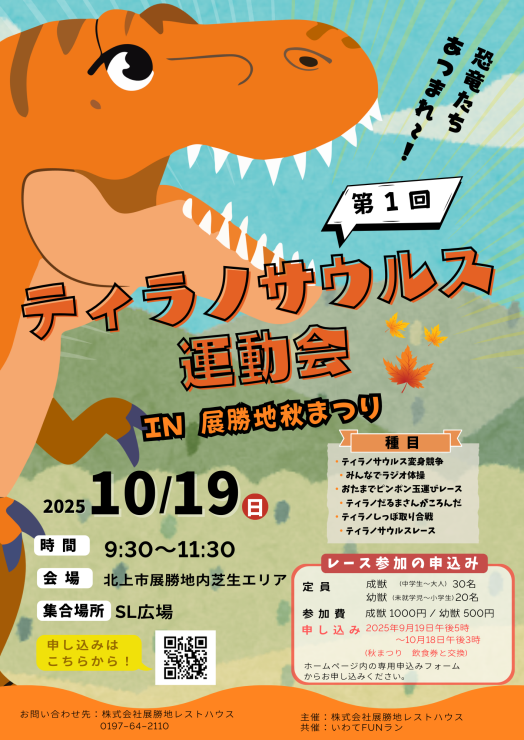 展勝地秋まつりに、ティラノサウルスイベントが登場!しかも参加費はそのまま秋まつりの飲食代として還元。ぜひ、ご家族またはグループでのご参加をお待ちしております♪