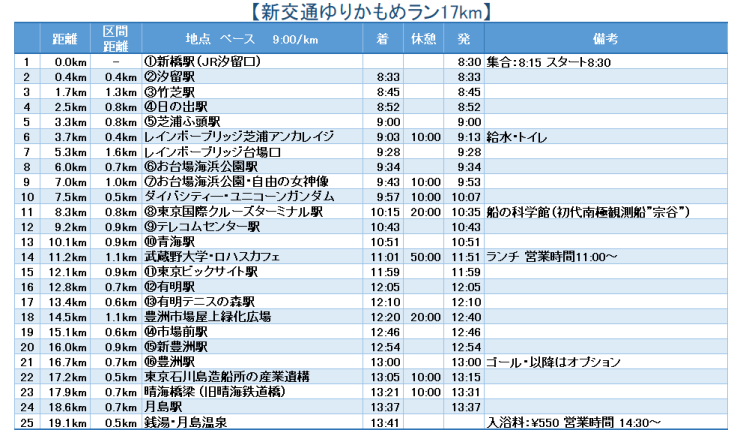 JR新橋駅汐留口8:20集合、8:30スタート ゆりかもめ豊洲駅15:00ゴール予定