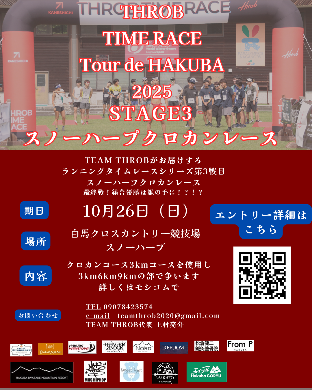 TEAM THROBが運営するランニングイベント。年間3回のシリーズ戦となっております。今回は第3戦目白馬クロスカントリー競技場スノーハープにてクロカンレースを開催。3kmコースを使ったラウンドレースとなります。単発参加もOK!!