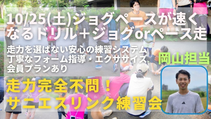 関東ですでに実績のある走力完全不問のランニングクラブ、サニエスリンクです。安心の練習システム、身体の仕組みをうまく使った専門的なストレッチやエクササイズ、丁寧なフォーム指導に定評があります。今まで関東エリアをメインに練習会を運営していましたが、2025年9月より、岡山県総合グラウンドでも練習会を新規スタートしました!ぜひご参加ください!