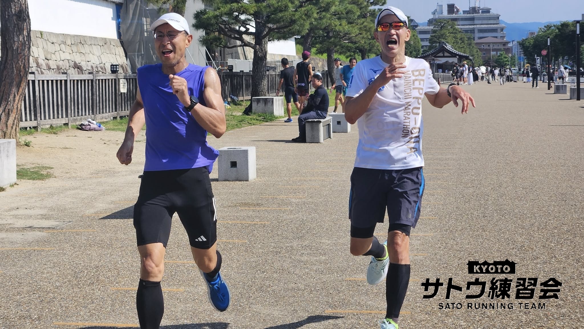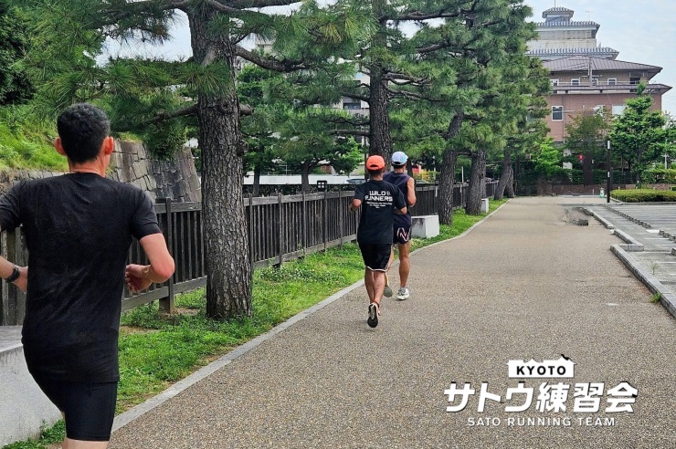 限界を超えるサトウ練習会。ホームコースの二条城でのスピード練習です。短い距離を速いペースで走ることでフルマラソンに必要なスピードとスピード持久力を養います。レペティション走といいます。二条城は1周約1.9㌔。道幅が広くランナーも多いので、安心して走れます。必要に応じて負荷を調整し、ご自身のペースで走っていただけます。初級者のかたもぜひご参加ください。練習後は大きな達成感を味わえます。